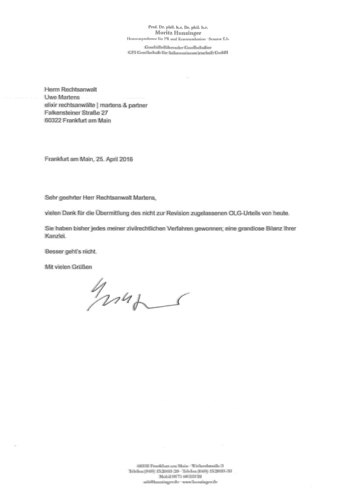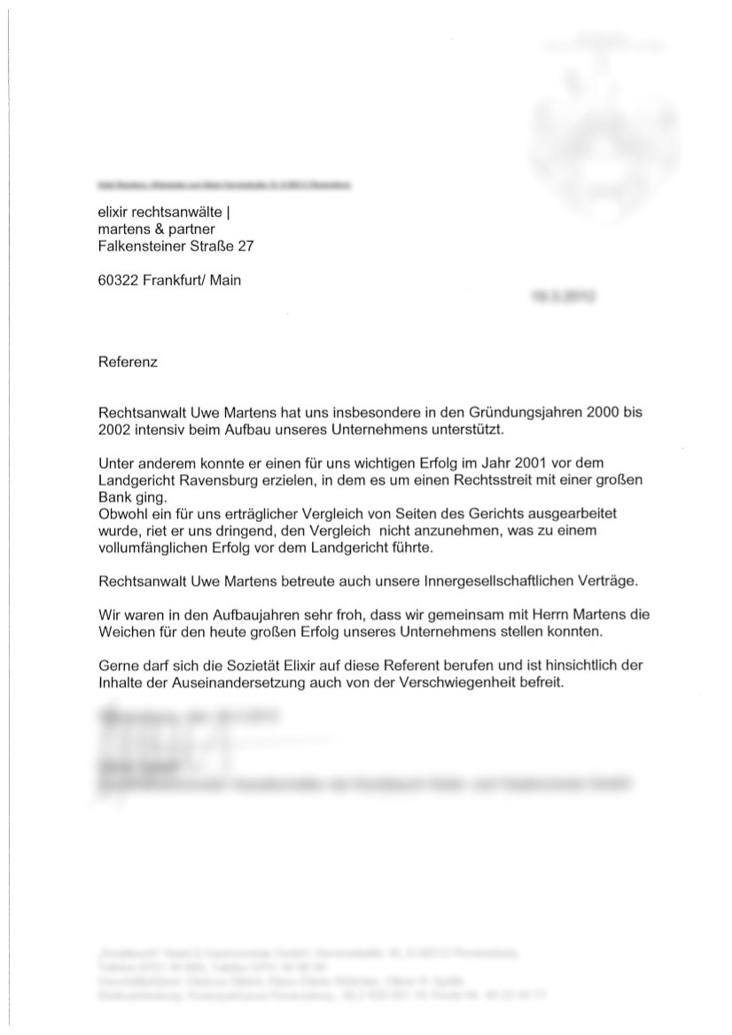Sollten Sie also Negatives über uns hören, hinterfragen Sie diese Meinung bitte kritisch. Oft handelt es sich um Gegner, gegen die wir konsequent vorgehen. Natürlich probieren diese dann, uns im Internet oder in der Öffentlichkeit schlecht zu machen, gerade wenn wir gegen unlautere Geschäftspraktiken („Abzocker“) vorgehen. Insbesondere auf Blogseiten (etwa wordpress, blogspot) oder auf verschiedenen Foren lassen sich anonyme Beiträge posten, die Zweifel an unserer Reputation streuen sollen. Das kontern wir leicht mit unseren Erfolgen und Referenzen.